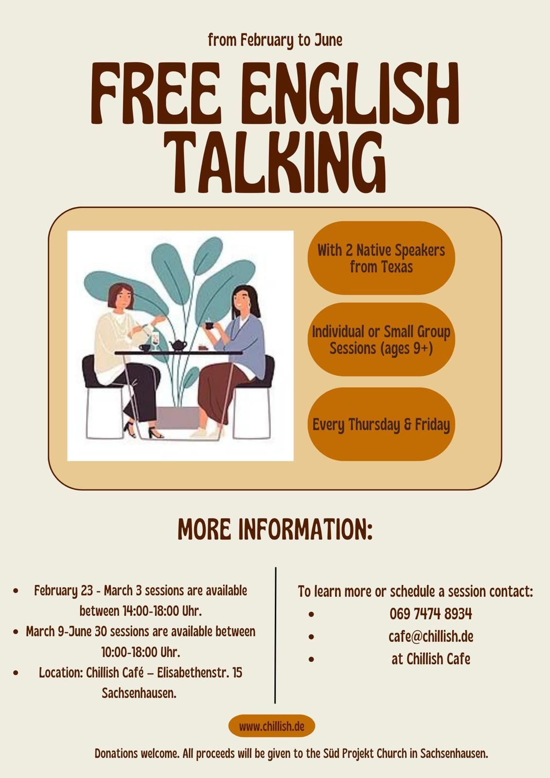 2 englische Muttersprachler stehen jeden Donnerstag und Freitag von Februar bis zum 30. Juni zur Verfügung.